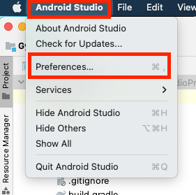 1. 안드로이드 스튜디오의 Android Studio > Preferences... 메뉴를 클릭합니다.
