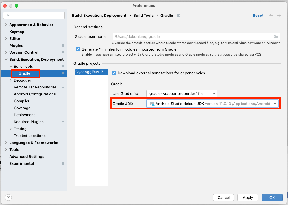 2. Preferences 화면에서 Build Tools > Gradle > Gradle JDK를 Android Studio default JDK 로 변경하고 다시 컴파일하면 해당 오류가 해결됩니다.