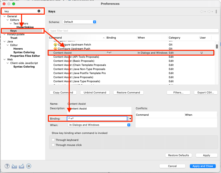 2. Preferences 화면에서 좌측 필터에 key를 입력하고, 필터된 항목중에 Keys를 선택하고, Content Assist항목을 클릭 후 Binding에 Ctrl + Enter로 설정하였습니다.