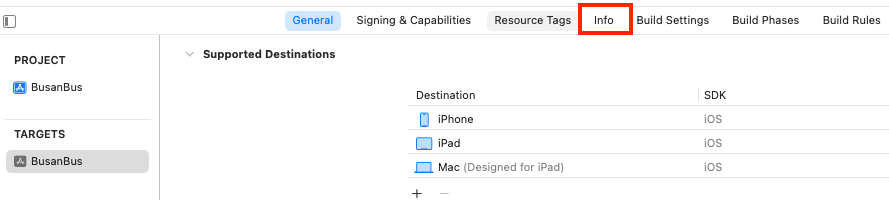 2.프로젝트 설정들에서 Info 탭을 선택합니다.