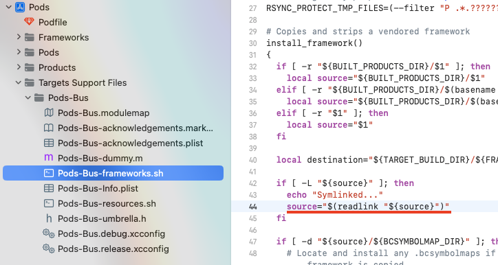 해결방법은 아래의 위치에서 source="$(readlink "${source}")"를 source="$(readlink -f "${source}")"와 같이 변경 후 다시 Archive 를 실행하면 정상적으로 컴파일됩니다.