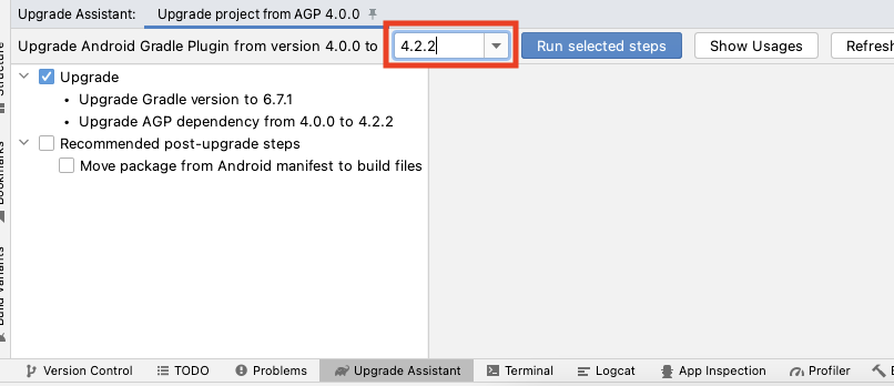3. Run Selected steps 버튼을 클릭하면 Gradle이 업그레이드 됩니다.